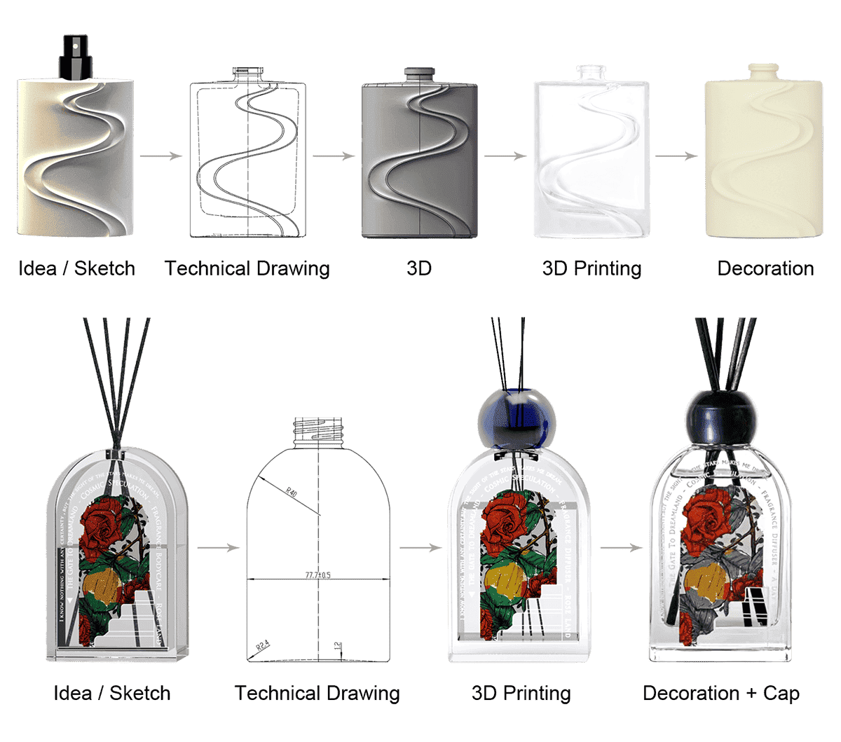 It is important for 3D printing to design a viable technical drawing. our team starts making the drawing after you accept the solution of glass packaging, you need to wait patiently for the final drawing because it is a process of repeated revisions. after you confirm the final drawing, we can proceed to do the 3D printing to show you the full shape of glass bottle. and also, we can send the 3D model to you for checking.